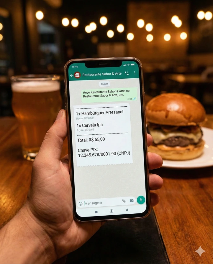 Na hora de cobrar, elimine atritos e a impressão de papel. Com apenas um clique, o sistema gera um extrato digital elegante e detalhado com tudo o que foi consumido na mesa. Essa conta exata é enviada instantaneamente para o WhatsApp do cliente, junto com a sua Chave PIX, facilitando o pagamento sem filas